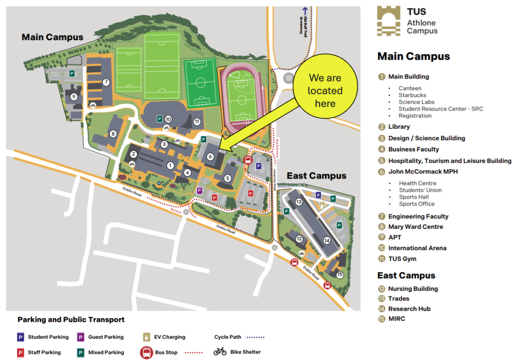 We are located in the Count John McCormack Building on the Athlone Campus.