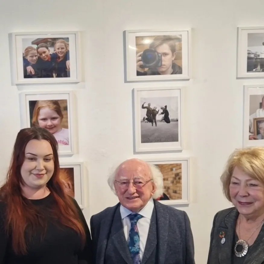 Chloe McDonagh from Tullmore, Co Offaly, is pictured with President of Ireland Michael D. Higgins and his wife, Sabina, at the launch of The Pisreóg exhibition at the Axis Art Centre and Theatre in Ballymun earlier this year.