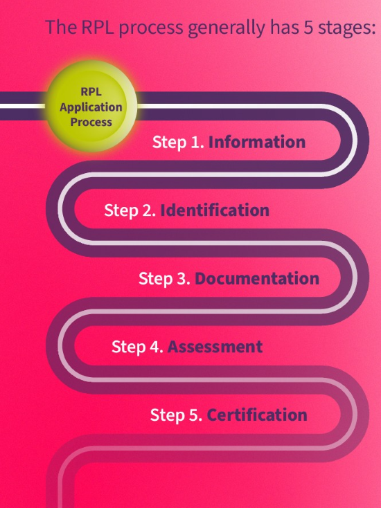 - Information: During this stage, you (the learner) obtain information about what is possible (e.g. RPL for entry or exemption) and how the RPL process works.